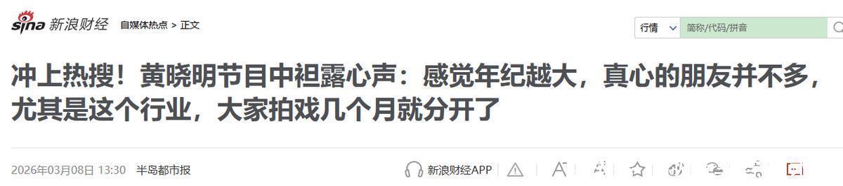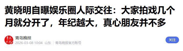 阅读此文之前,麻烦您点击一下“关注”,既方便您进行讨论和分享,又能给您带来不一样的参与感,您的支持就是我最大创作动力! “感觉自己年纪越大,真心的朋友并不多。” 黄晓明在最新综艺《宇宙闪烁请注意》中的直球发言,瞬间冲上热搜,也戳中了无数人的心声。 谁能想到,这位深耕娱乐年的顶流影帝,合作半个圈子,人脉看似遍地,风光无限的背后全是伪装。 他直言,拍戏时的热络都是暂时的,杀青就各奔东西,真心朋友少到可怜。 而这份反差背后,藏着娱乐圈最扎心的人际真相,看完让人破防! 真心朋友不多,是黄晓明在综艺《宇宙闪烁请注意》里,被黄子韬直白追问后给出的答案。 节目里,他和黄子韬、王鹤棣、刘耀文等一群比自己年轻的弟弟们相处融洽,没有前辈的架子,也没有明星的伪装。 毕竟在这个名利场里,大多数相处都带着工作的属性,很难有纯粹的交心时刻。 黄晓明口中“拍戏后很快就分开”,道尽了娱乐圈人际关系的常态。 他解释,圈内人聚在一起,大多是因为拍戏,几个月的时间里,大家同吃同住,并肩合作,看似熟络无间。 可一旦戏份杀青,剧组解散,就会各奔东西,之前的热络也会慢慢消散。 这份聚散无常,让很多看似亲近的关系,最终都沦为了点头之交。 没人能想到,这个在镜头前总是笑容温和,人脉广阔的顶流,内心竟藏着这样的孤独。 提起黄晓明,很多人会想到他的资源,他的成就,想到他和圈内众多艺人的合作过往。 可很少有人知道,这些看似繁杂的社交,大多是工作所需。 他坦言,自己圈外的朋友比圈内多,因为圈外的情谊没有利益纠葛,知根知底,相处起来不用小心翼翼。 圈外的情谊纯粹自在,圈内的相处却往往掺杂着太多身不由己。 黄晓明在圈内的合作不计其数,和刘亦菲的十九年交情,算是圈内难得的例外。 两人因《神雕侠侣》结缘,拍戏时曾有过“过命的交情”,刘亦菲被水流冲远时,是黄晓明毫不犹豫跳下水救人。 那些在艰苦实景拍摄中互相扶持的时光,建立了两人深厚的情谊。 可即便如此,他们也鲜少同框,却在彼此需要时默默站台,用行动证明真心无需刻意维系,而接下来黄晓明所讲的经历,藏着所有艺人的无奈与心酸! 并非所有合作都能沉淀出这样的情谊,更多的是拍完戏就各自疏远的匆匆过客。 黄晓明曾在镜头前透露,竞选《神雕侠侣》杨过一角时波折不断,最初出品方属意的并非他。 一番竞争后才意外拿下这个角色,甚至还被金庸直言演得太“浮夸”。 那段时间的他,既有事业上的压力,也有无人倾诉的委屈,而这样的情绪,很难在圈内找到人坦然诉说。 真心朋友不多,不代表黄晓明从未交心,只是他早已看透了圈内的社交本质。 他在综艺里和弟弟们打闹互怼,格外珍惜这段没有利益纠葛的相处时光。 因为在这里,他不用扮演“黄晓明”这个标签,不用考虑资源置换,不用在意言行是否会被过度解读,只需做最真实的自己。 其实黄晓明的感慨,戳中了很多娱乐圈艺人的心声,只是很少有人像他这样坦诚。 这个圈子里,流量更迭飞快,资源竞争激烈,今天是并肩合作的伙伴,明天可能就是竞争对手,利益的牵绊让真心变得格外昂贵。 很多艺人看似朋友遍天下,可等到深夜翻遍通讯录,却找不到一个可以毫无保留托付情绪的人。 有人说黄晓明太矫情,拥有如此高的成就,何必纠结于真心朋友的多少,可只有身处其中,才能明白这份孤独的重量。 他曾因“闹太套”的梗被全网嘲讽,陷入抑郁,甚至有过厌世的念头。 那段最黑暗的时光,没有多少圈内人站出来为他发声,更多的是旁观者的冷眼和调侃。 也是从那时起,他愈发明白,真心朋友不在数量,而在质量。 如今的黄晓明,早已褪去了年轻时的浮躁,多了几分通透和从容。 他不再刻意追求圈内的人脉,不再勉强自己融入不适合的圈子,而是把时间和精力放在事业和公益上。 他的公益长跑坚持年,累计捐款捐物万元,资助贫困学生,参与应急救灾,用行动诠释着公众人物的担当。 那么褪去浮躁后的他,究竟如何在孤独中守住真心,扛起担当? 他依旧会和圈内艺人合作,依旧会参与各种社交场合,但早已学会了取舍。 拍戏时认真合作,拍完戏各自安好,不刻意维系,也不勉强讨好。 对于真心相待的人,他会默默守护,就像对刘亦菲那样,跨越十九年依旧情谊不减。 对于那些只是工作交集的人,他保持礼貌,点到为止,这是他在娱乐圈多年摸爬滚打,总结出的生存之道。 黄晓明自曝的不仅是自己的社交困境,更是整个娱乐圈的人际关系真相。 聚光灯下的热闹是表象,镜头背后的孤独才是常态,拍戏时的并肩同行,终究抵不过现实的各奔东西。 但即便如此,他依然没有放弃对真心的期待,依然珍惜那些难得的温暖,这份坦诚,比圈内所有的虚假客套都更动人。 真心朋友不多,从来都不是遗憾,而是成年人世界的常态。 无论是身处光鲜亮丽的娱乐圈,还是奔波忙碌的普通人,我们都在慢慢明白,社交的意义不在于数量,而在于质量。 与其拥有一群逢场作戏的朋友,不如守住几个真心相待的知己。 哪怕平时不常联系,哪怕相隔千里,也能在需要时彼此支撑,这就足够了。 黄晓明的经历,不过是把这份感悟,直白地说了出来。 黄晓明的坦诚,没有抱怨,没有委屈,只有对生活的通透和对情谊的珍视。 他用自己的经历告诉我们,无论身处哪个圈子,无论拥有多少成就,真心永远是最珍贵的东西。 在这个快节奏,重利益的时代,愿